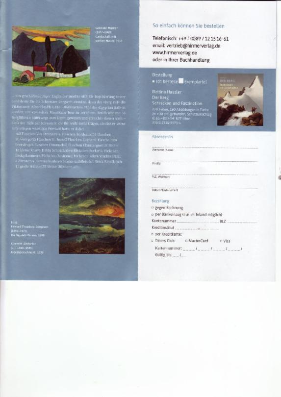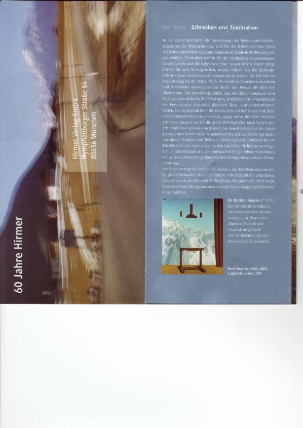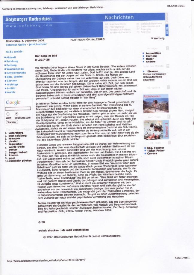 "Während der letzten 20 Jahre ist eine eigentliche Renaissance der Alpen zu beobachten, von der politischen Aktion über die Landart bis zur aufwendigen Puplikation. Die bayerische Kunsthistorikerin Bettina Hausler hat ihr prächtiges Bilder-Buch in diesen Kontext gestellt und beschreibt in ein eindrücklicher Weise den über die Zeit hinaus gebannten Blick auf den Berg, gesehen von Goya, Wolf, Turner, Vallotton, dem Fotografen Lukoschek und anderen Hochbegabten."