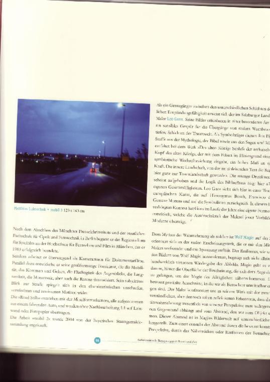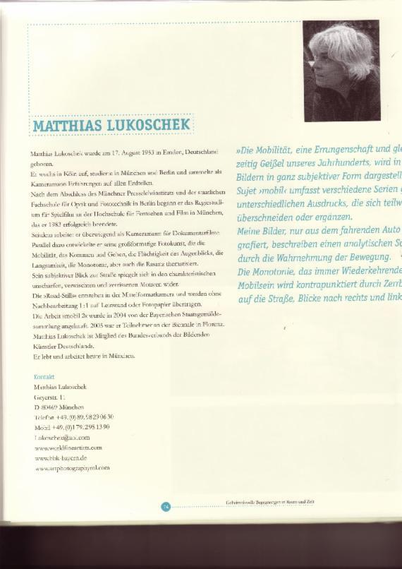 "On the road again". Die Fotografien von Matthias Lukoschek sind eher Werke eines Kameramanns als die eines Fotografen. Nicht umsonst sind die meisten Bilder im Querformat oft sogar breitwandig aufgenommen. Wenn sie trotzdem der Realität gleichsam "entrückt" erscheinen, liegt das an der kreativen Beherrschung der Technik. Die unbelichteten Filme wurden auf Heizkörpern künstlich gealtert, um diese einmalig ungesättigte Farbqualität zu erreichen. (Weitere Geheimnisse sind nur vom Künstler selbst zu erfahren.) Jedenfalls sind die Fotos nur mit einem Normalobjektiv aufgenommen und wurden nicht mit Computer nachbearbeitet. Sie wurden per Tintenstrahl 1:1 vom Originalnegativ auf die Leinwände gedruckt, die wir in den Ausstellungen vor uns sehen. Von jeder Aufnahme gibt es nur 4 Ausdrucke. Gerade die Präsentation von Fotografien im gemäldegroßen Format betont und unterstreicht ihre Qualität.